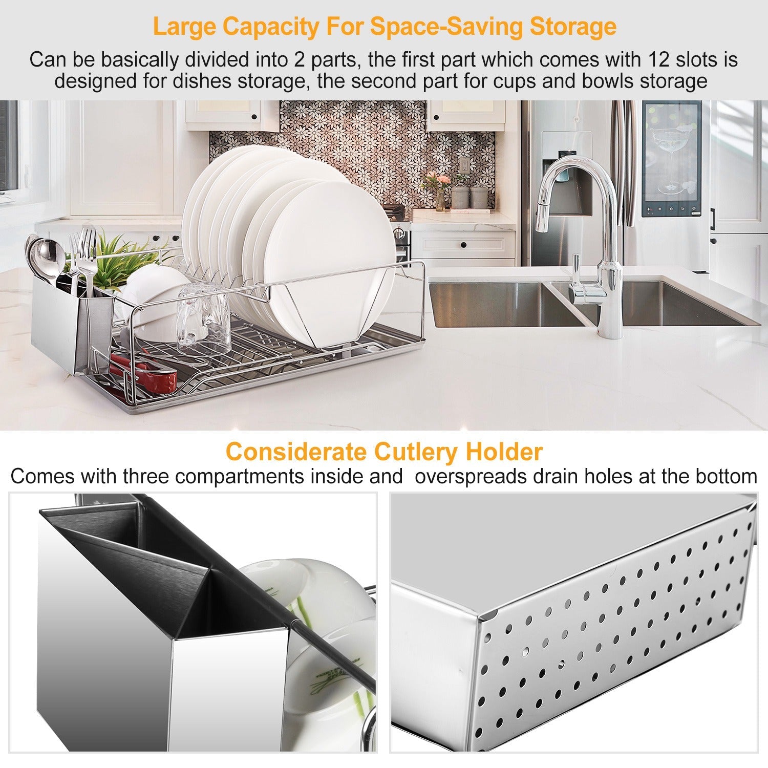 Space-Saving Design: With its innovative drainboard and cutlery holder, this rack maximizes your counter space while keeping your dishes organized.